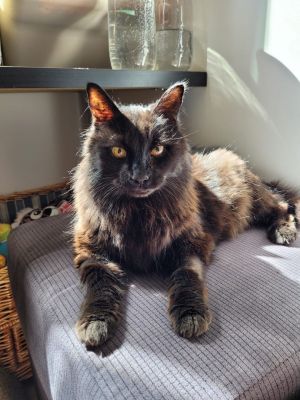 Adult cats as young as 8 or 9 are often passed by for adoption. All kinds of cat breeds come into our care. They have semi-long soft hair.